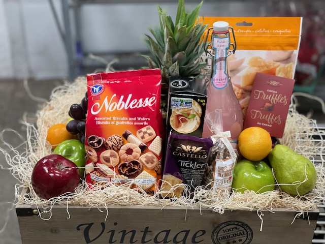 A fresh and colourful combination of fruit with pineapple, cheese, crackers, cookies and/or chocolates in a vintage box.