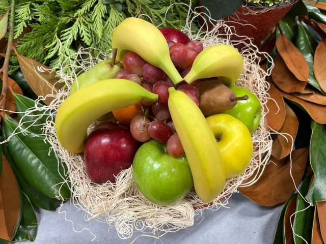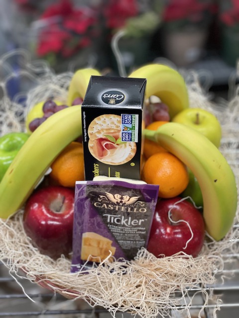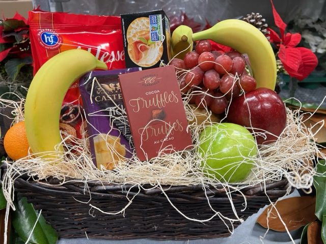 A fresh and colourful combination of fruit with pineapple, cheese, crackers, cookies and/or chocolates in a large basket or wooden crate.